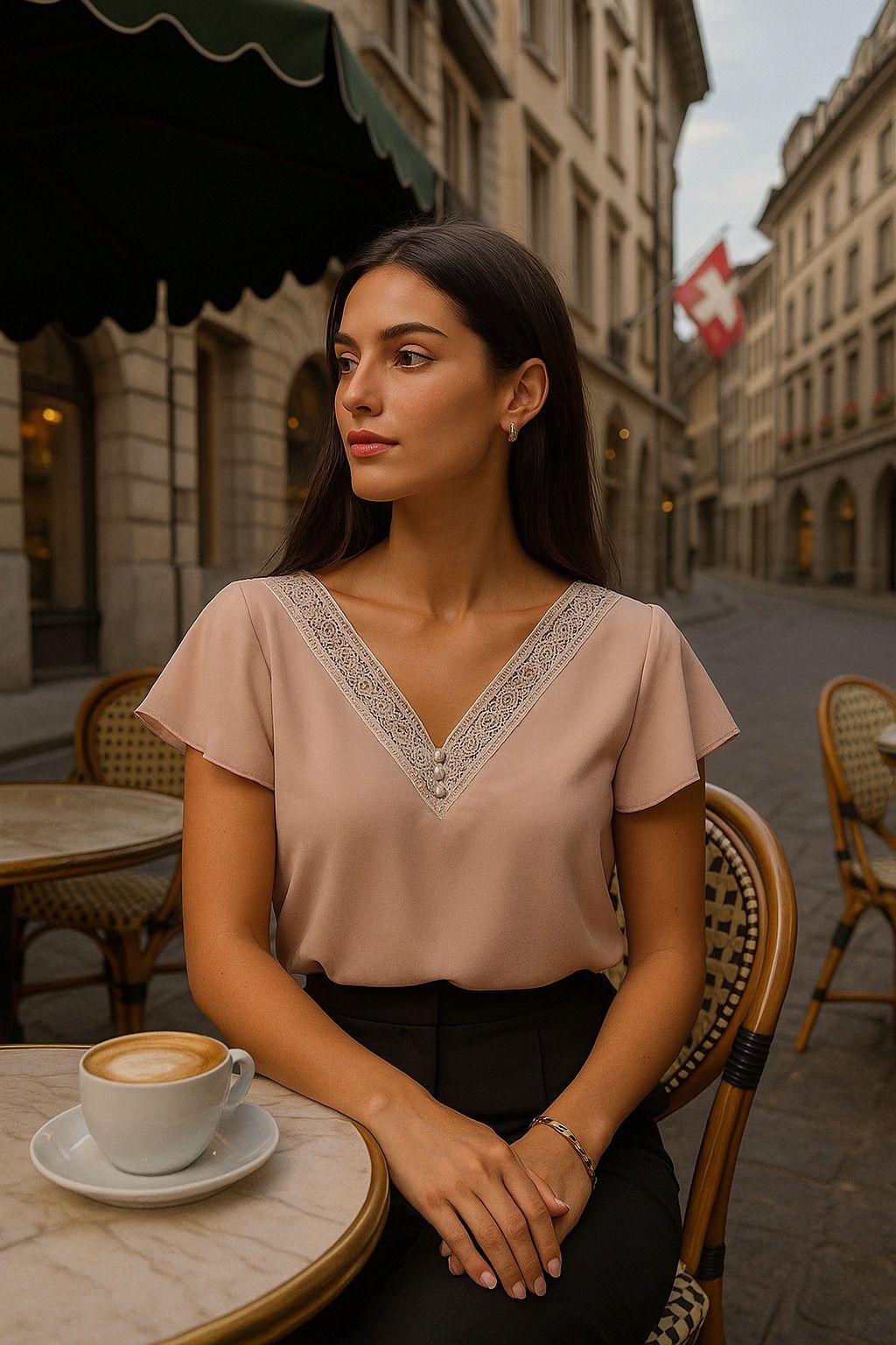 Blusa com manga jabot detalhes em renda no decote em V, botões decorativos madre Pérola. Costas com costura na horizontal e um pence na vertical.
