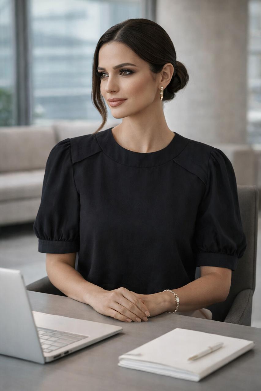 Blusa com detalhe nos ombros gola redonda com barrado largo, comprimento normal e fechamento com botão na nuca.