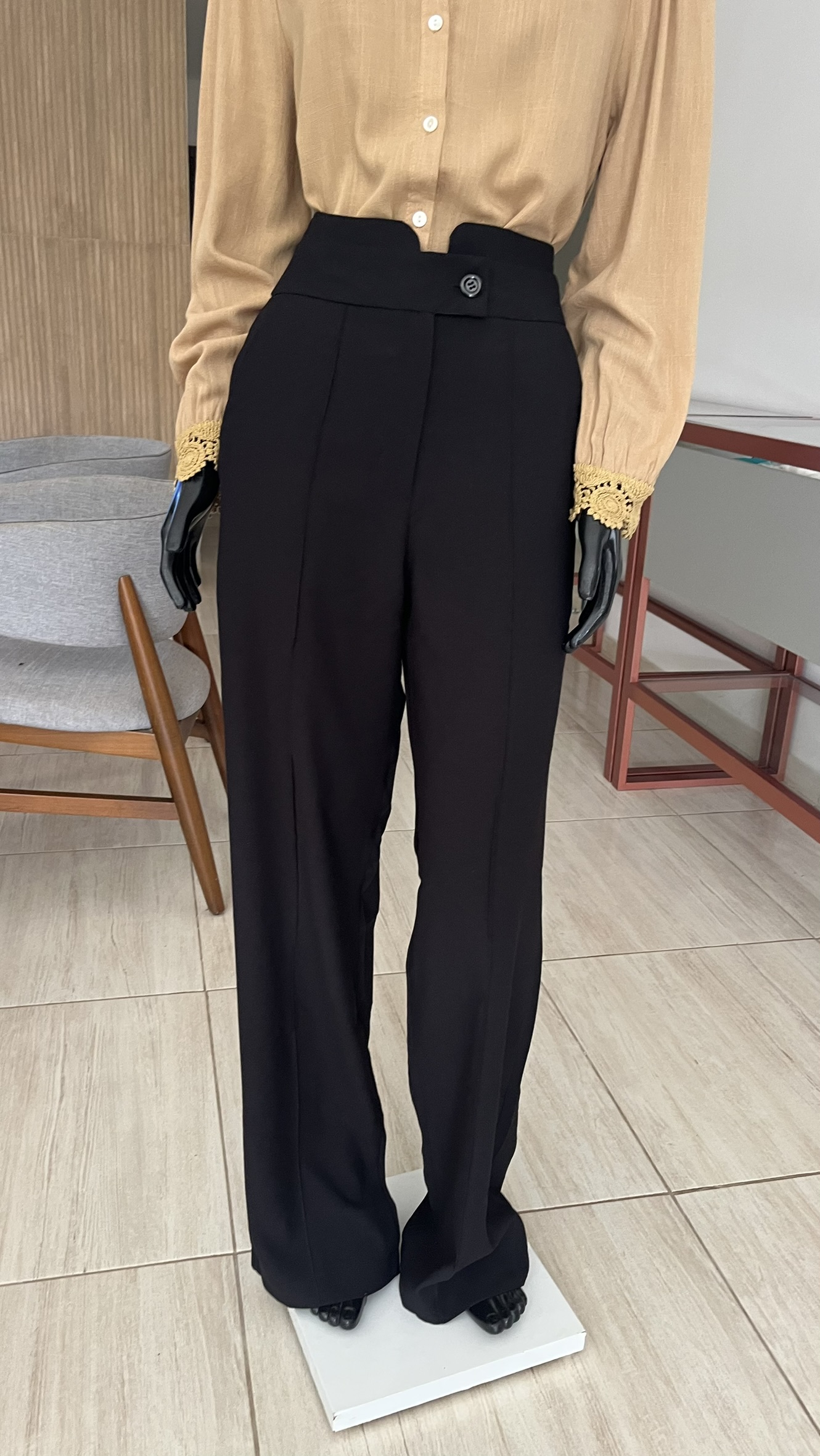 Calça alfaiataria, com modelagem de cintura alta e cós estruturado com detalhe de botão frontal. Possui nervuras que alongam a silhueta, além de bolsos laterais funcionais. O corte é reto com leve amplitude na barra, proporcionando caimento impecável e elegante. Tecido encorpado, confortável e ideal para composições formais ou modernas.