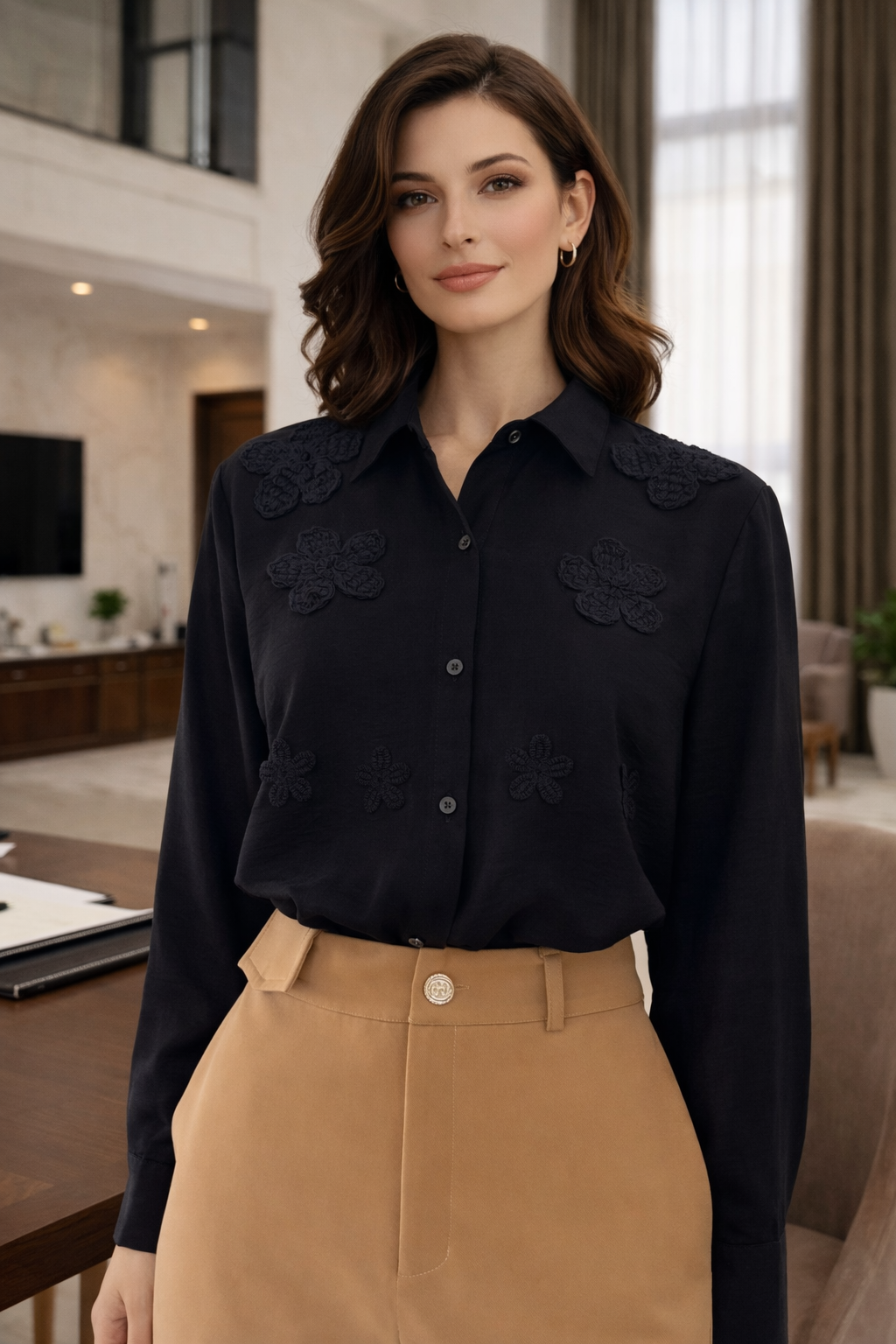 Camisa feminina elegante em tecido leve e fluido, com aplicação de flores feitas em crochê, em relevo, que trazem sofisticação e delicadeza ao look.