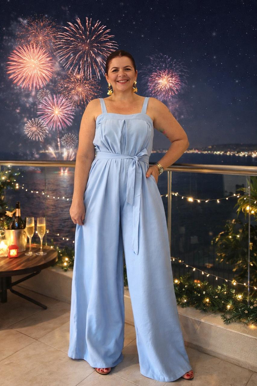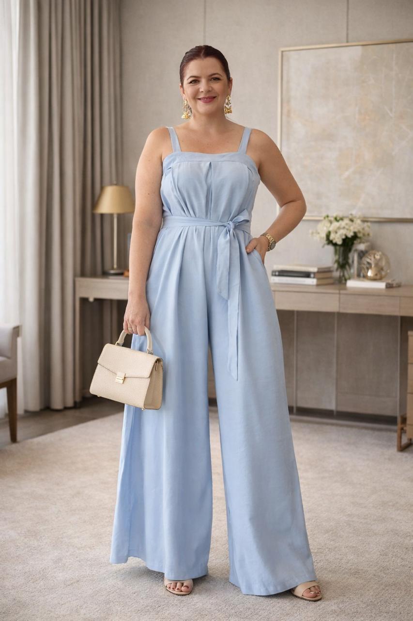 Macacão pantalona com decote reto, pregas na parte do busto, ziper nas costas, bolsos, passante com faixa para amarração na cintura.