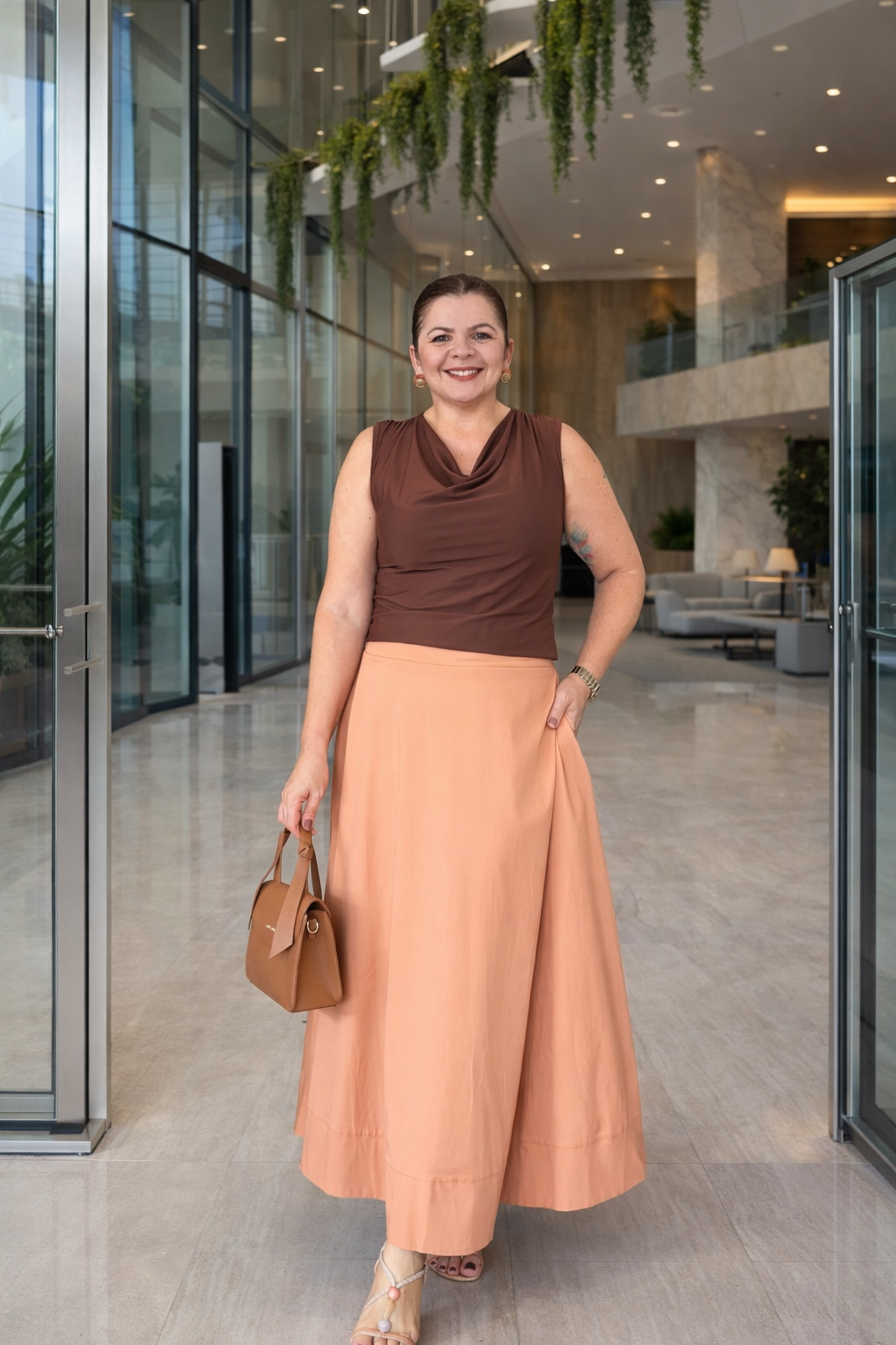 A saia apresenta comprimento midi, com tecido que proporciona bom caimento e leveza. A modelagem evasê ajuda a valorizar diferentes tipos de corpo sem marcar. Ideal para quem quer uma peça prática e charmosa para o guarda-roupa.